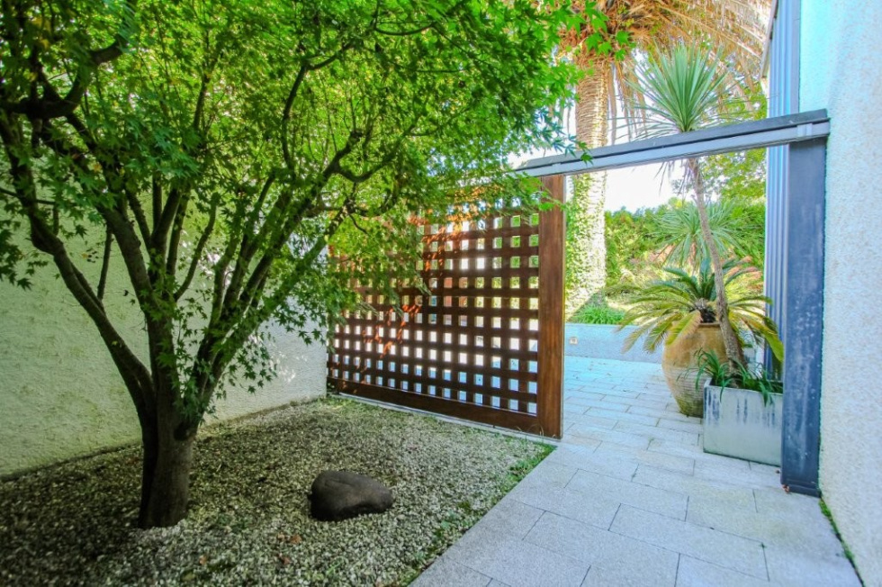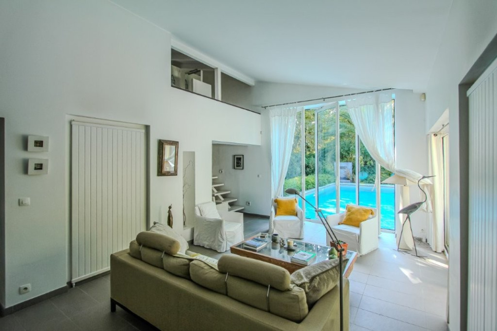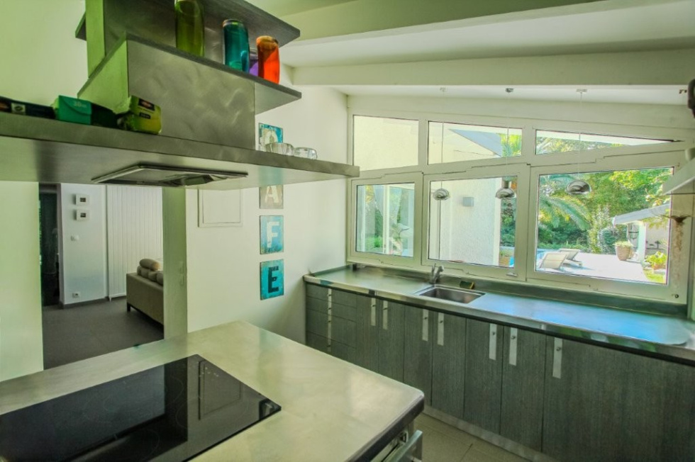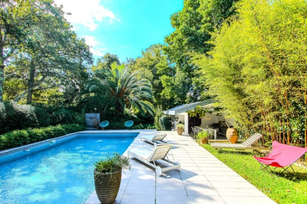 Biarritz, à quelques minutes du centre-ville, villa de 145 m² à l’abri des regards, exposée Sud-ouest, avec piscine sur un terrain de 1233 m², pourvu d’une végétation luxuriante. Salon (cheminée) / Salle à manger, Cuisine indépendante, 4 chambres, 1 salle de bain, 1 salle d’eau. Pool house. Piscine. Garage.