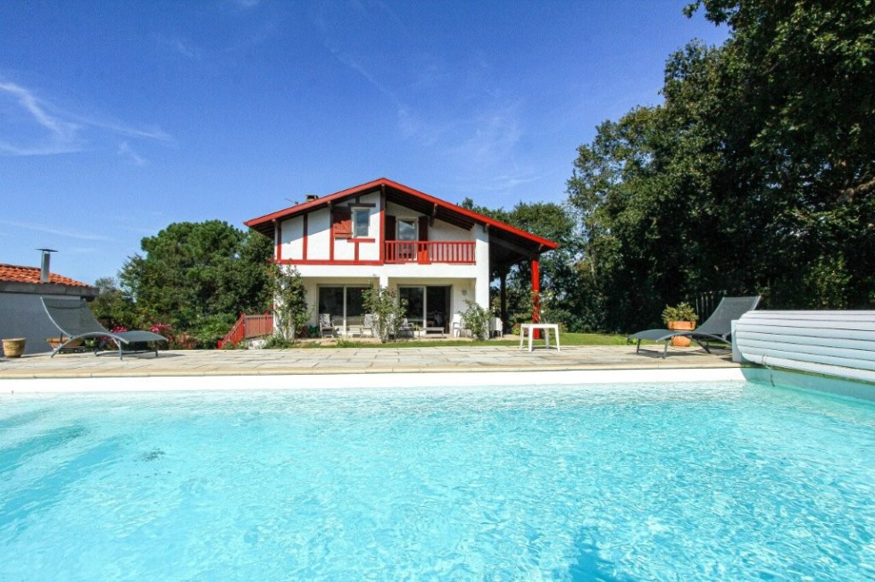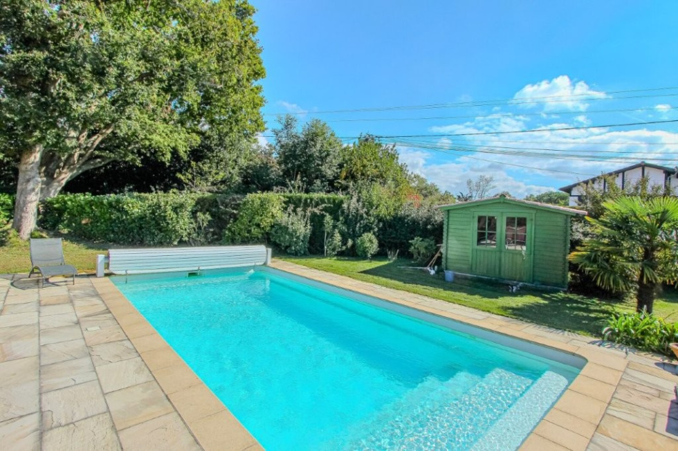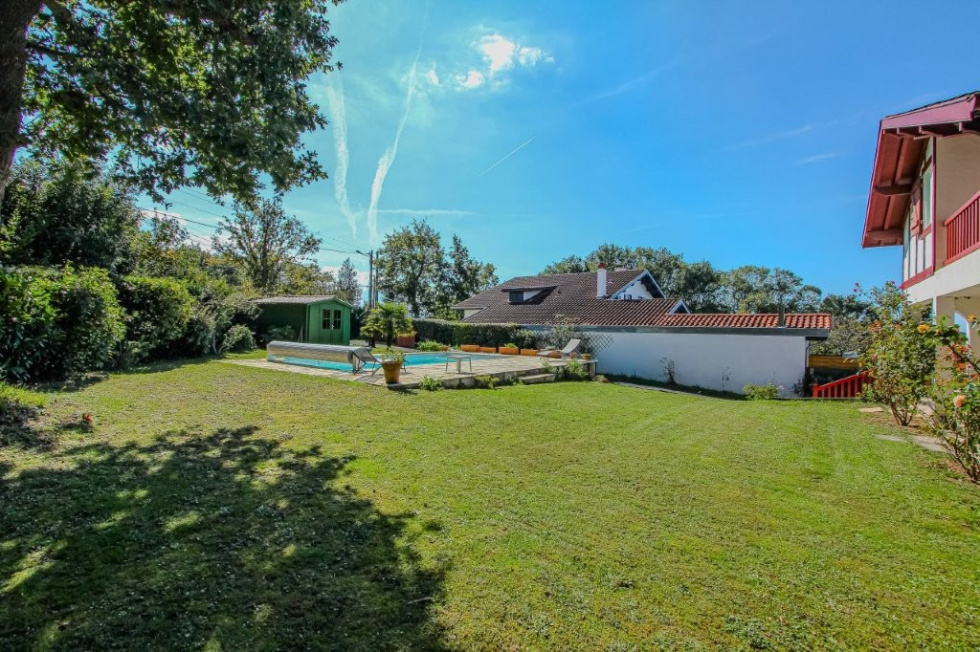 Arbonne, charmant village à proximité immédiate de Biarritz, belle villa de conception architecturale Basque dans un quartier paisible, vous propose une superficie habitable de 230 m² sur une parcelle arborée de 1499 m². Rez de chaussée et étage : salon/salle à manger, cuisine, arrière cuisine, 4 chambres, 2 salles de bains, 2 wc indépendants. Rez de jardin, grand salon, chambre sur salon, dortoir, buanderie, salle d’eau avec wc. Deux belles terrasses exposées Sud et Est et une belle piscine sécurisée et fermée.
